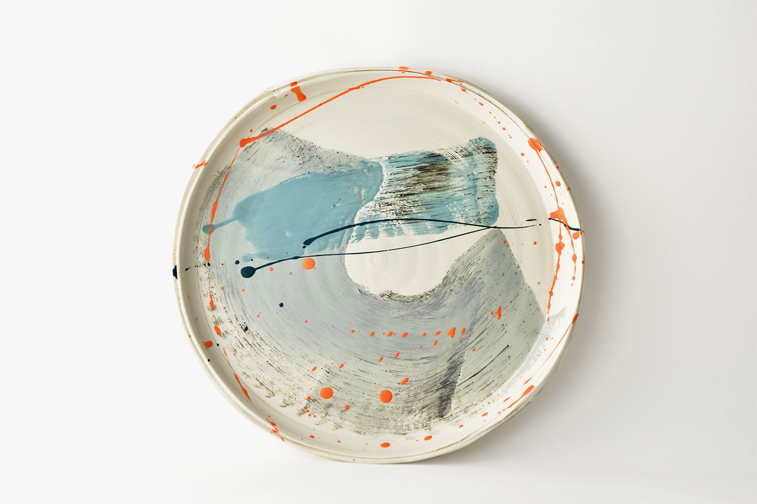 This plate was thrown on the wheel and decorated with abstract brushstrokes using grey, turquoise and orange porcelain engobe. The piece is unglazed.