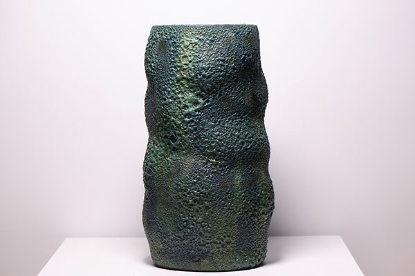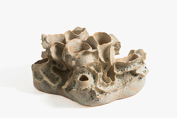 Symbiosis is a sculptural double vase inspired by barnacles. The sculpture is formed using the coiling technique, and it is hand-carved, glazed, and decorated with hand-painted platinum details all over.