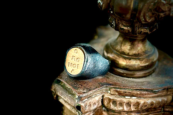 Here are three soft-hammered bronze rings with polymer clay stones created with a revised and adapted scagliola technique. The inspiration for the stone decor comes from the precious black and white marble inlays of San Miniato al Monte in Florence, with geometric figures, lions and unicorns, hawks and doves, and the Zodiac of life. From left to right: rings C08 Bronze, C05 Bronze and C03 Bronze with replaceable stones San Miniato C08, C05, and C03 Black.