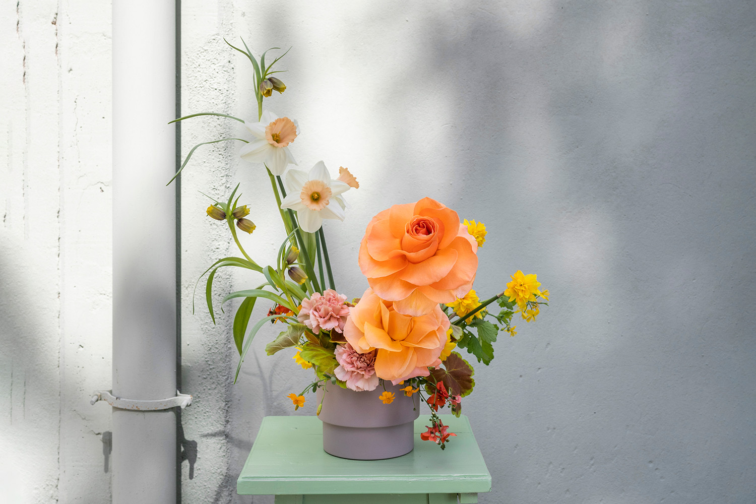 This asymmetrical arrangement is made of roses, dianthus, fritillary and daffodils, inspired by the Japanese art of ikebana but interpreted in a Western way. For the structure, Chiara Sapiente did not use flower foam but chicken wire and kenzan which are more sustainable.