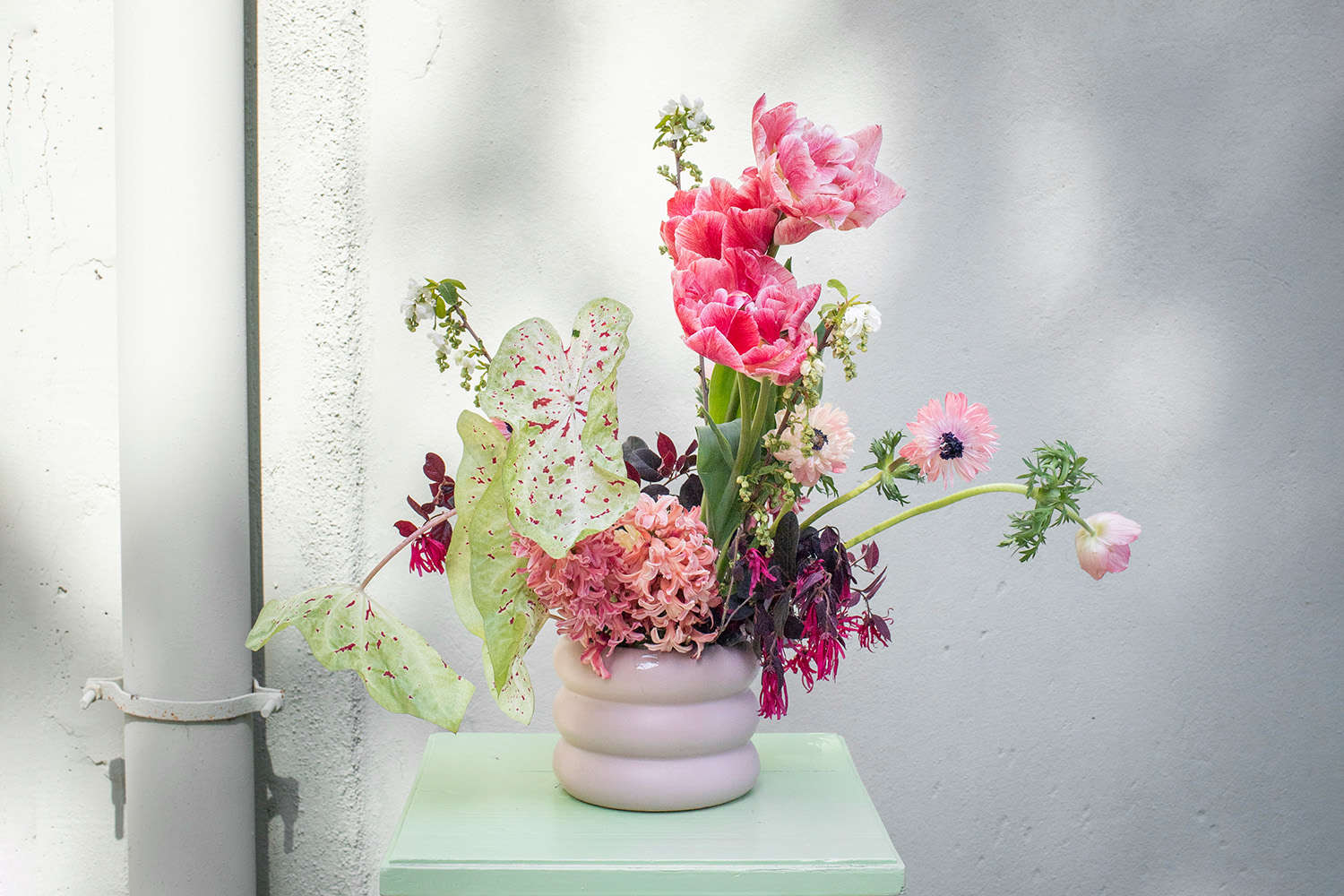 Hyacinths, tulips, loropetalum, pasqueflower and caladium are beautifully arranged in a vase, and supported by chicken wire. The composition is asymmetrical and developed both horizontally and vertically. The color palette is dominated by pink shades.