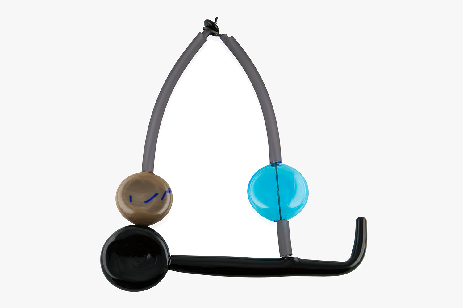 Characterised by a modern and original design, the Baffuta necklace features a black element juxtaposed with a see-through aquamarine bead that illuminates the creation. It is composed of mouth-blown and lampworked Murano glass beads complemented by grey PVC segments and a glass clasp.