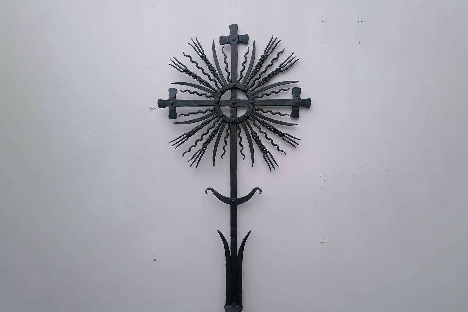 This is a traditional Lithuanian folk cross. These types of crosses were forged by Lithuanian folk masters to portray folk heritage ornamentation.