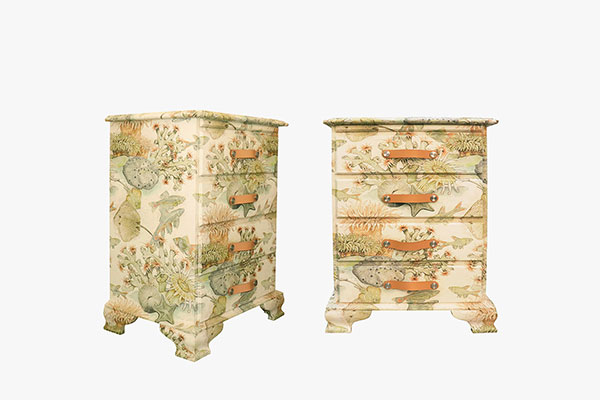 This antique wood table was restyled by hand with decorative painting of black marble on the top, matte black paint on the rest of the structure, découpage of a typical Portuguese folklore pattern on drawers and light distressed gold leaf on the piping. The piece was finished with protective lacquer.