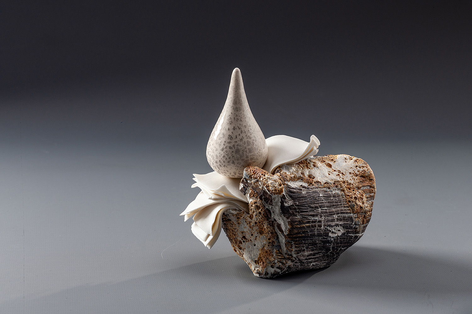 This ceramic sculpture is made of a shiny white thrown teardrop balanced on a pile of paper-like ruffled porcelain sheets. The white porcelain sheets rest on a rough and textured hand-built rock-like form of black, brown and white.