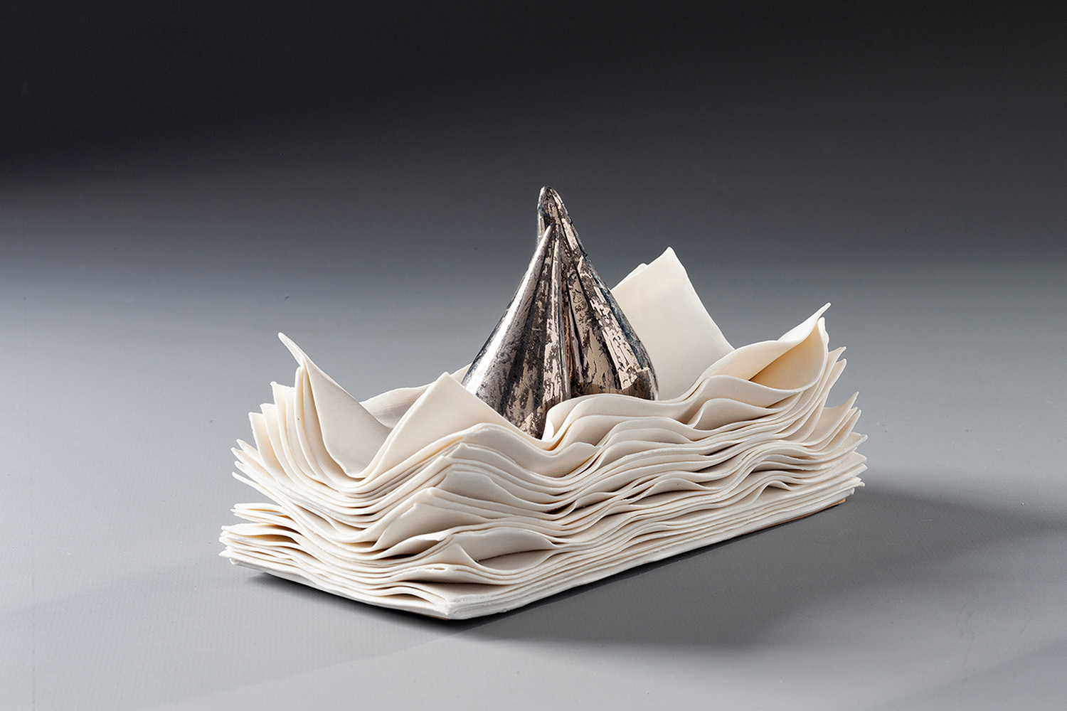This sculpture is made of porcelain and earthenware. Two mottled platinum and black thrown teardrops lean towards each other and touch slightly. They sit in a stack of thin white paper-like sheets of unglazed porcelain seemingly ruffled at the edges.