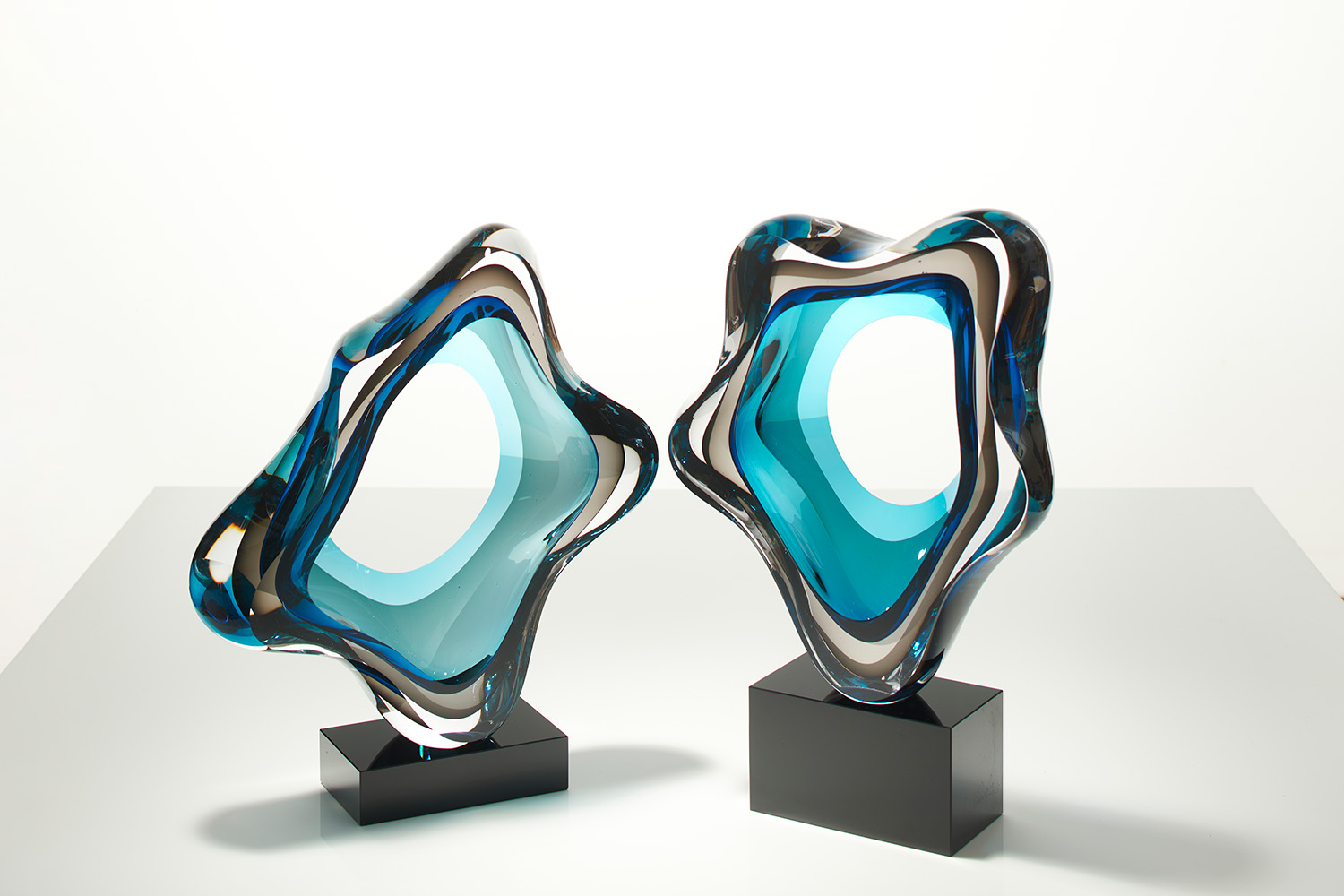 This is a pair of freeblown glass sculptural forms, cut, polished and mounted on glass bases.