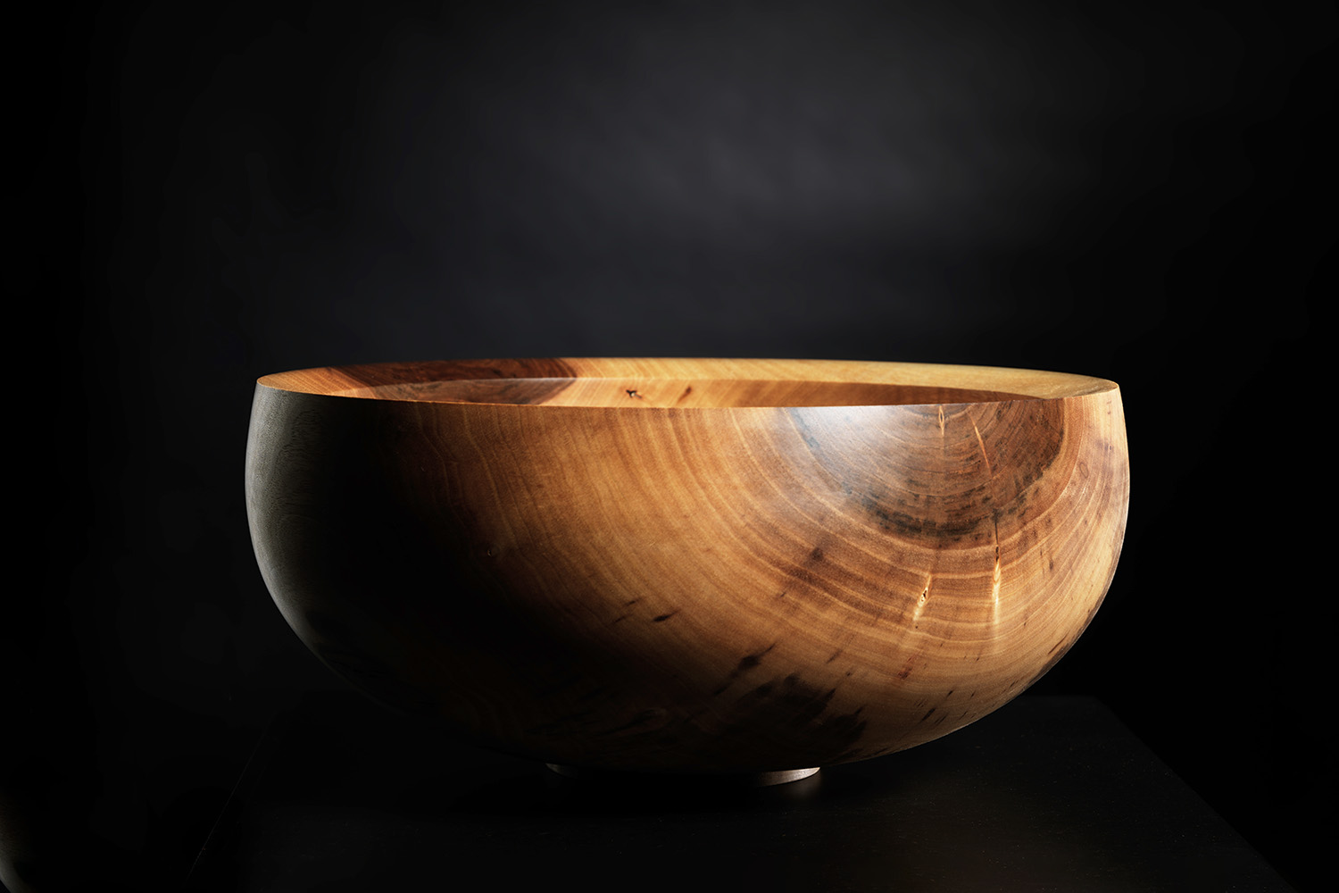 This large, turned bowl was pre-turned wet then reworked on the lathe. The surface is oiled and designed to incorporate the contrast between light sapwood and dark heartwood to form a semi-circular decoration on the edges of the piece.