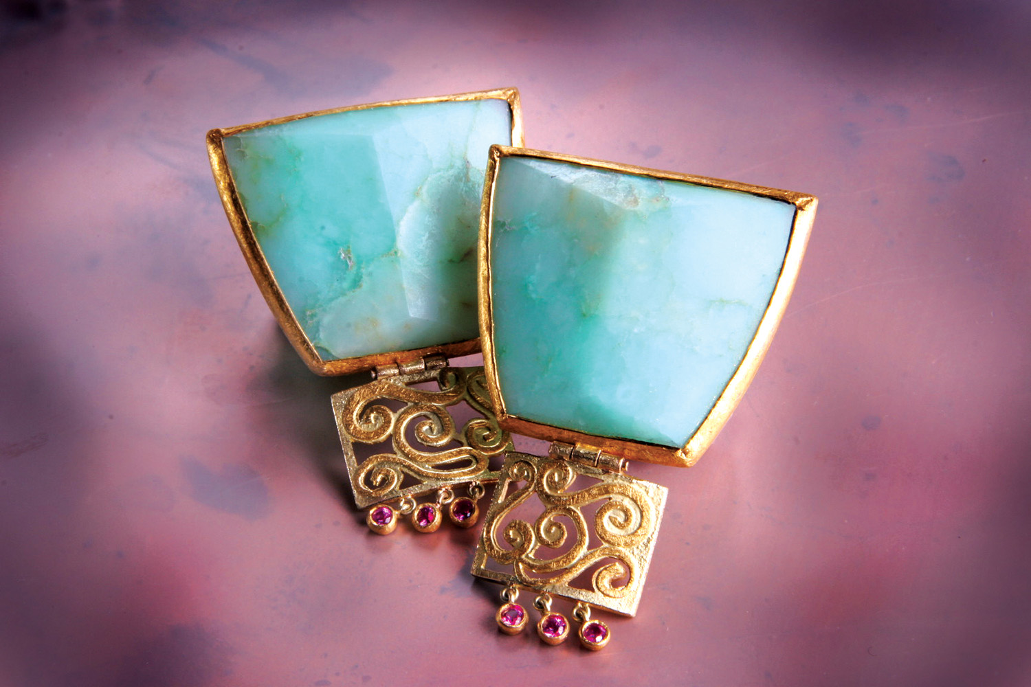 These gold earrings are composed of five segments, including a trapezoidal chrysoprase, a square leaf adorned with wavy ornamentics and three small rubies.