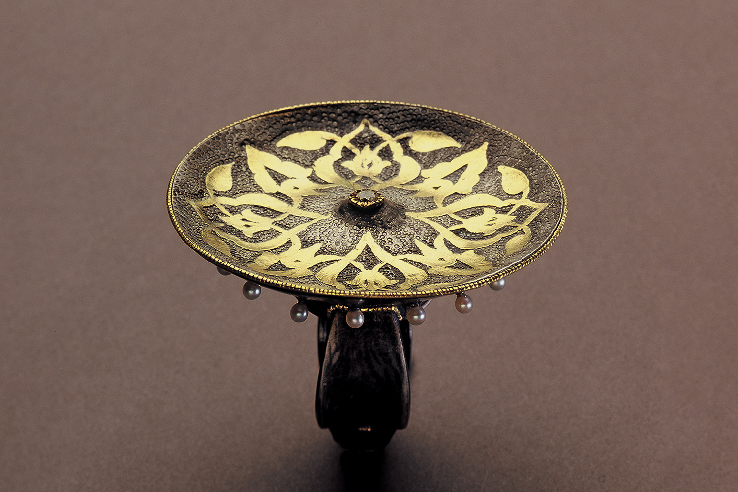 Sterling silver makes up this heavy ring. Its top consists of a bowl-shaped disc decorated with diamonds in the centre. An ornament reminiscent of a leaf surrounds the diamond. Freshwater pearls are arranged below the disc.