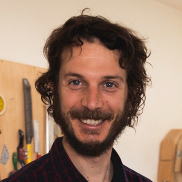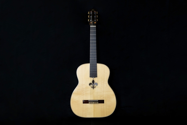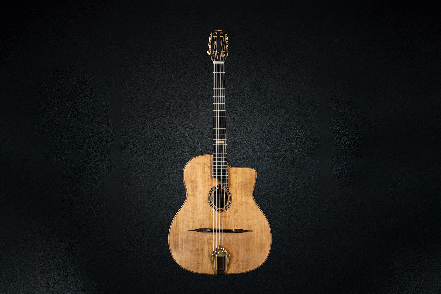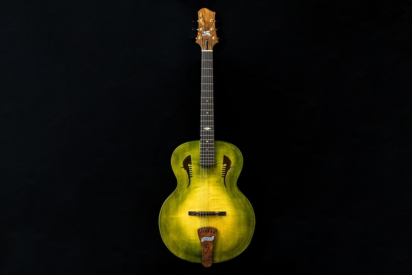This is a copy of the original Selmer guitar. The spruce soundboard has traditional bending just behind the bridge. The backbands are made of olive wood, the board is ebony walnut, and white and gold mother-of-pearl inlay sit at the 12th key.