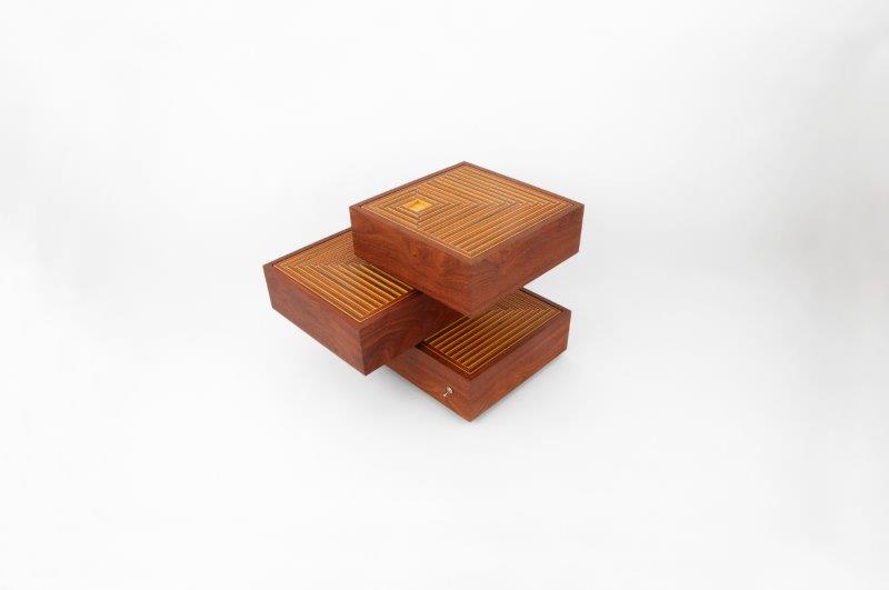 This is a wooden lamp, although it seems like a low side-table when unlit. It is entirely made of wood.