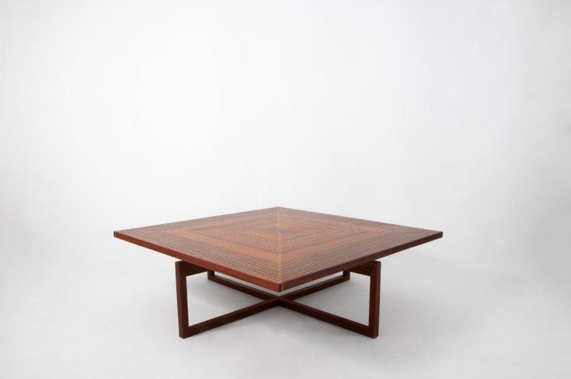 This is a handmade low centre table, made with macacaúba and satinwood. The floating table top is made entirely with intricate marquetry work designed with a repetitive pattern so as to create a sense of infinity.