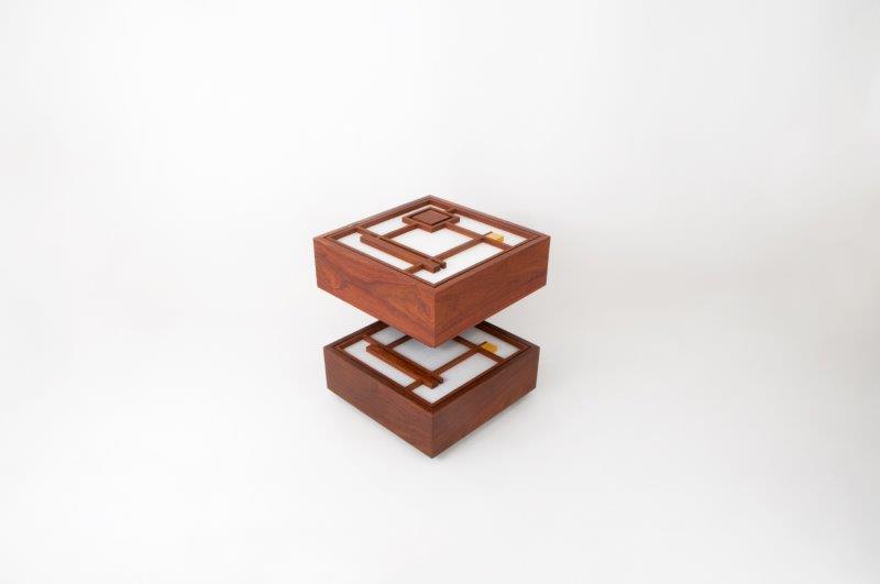 Shado rp-v lamp is a wooden lamp designed from the balance between opposites. A complex and intricate joinery is hidden by two suspended parts on top of each other. When lit, the weight and dark wood contrasts with the white rice paper, accentuating the lightness of this sculptural piece.