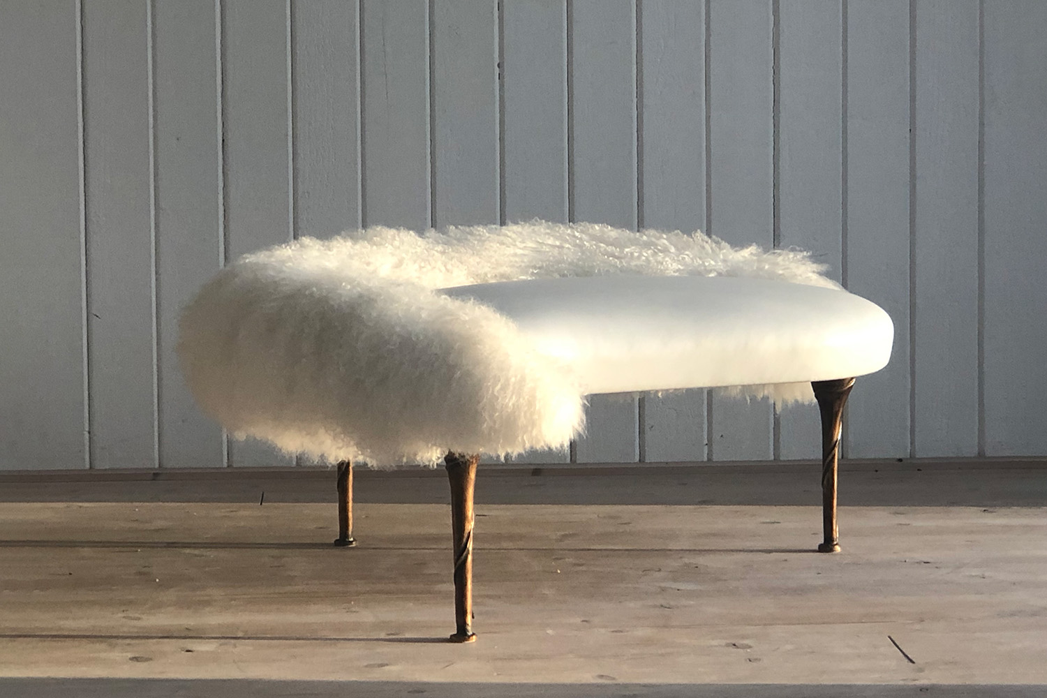 This bench is one of the furniture sculptures designed and handmade by Susanne Sjögren using traditional upholstery techniques developed in Europe in the 18th century. The seat is in leather and sheepskin, the legs in bronze.