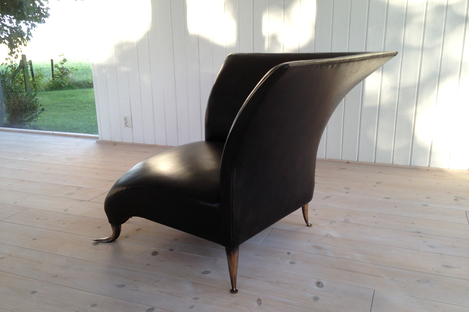 This artistic armchair is covered in black leather, while the legs are in bronze. It was designed by Susanne Sjögren as part of her furniture sculptures. Entirely handmade, the upholstery reflects the standards developed in Europe in the 18th century.