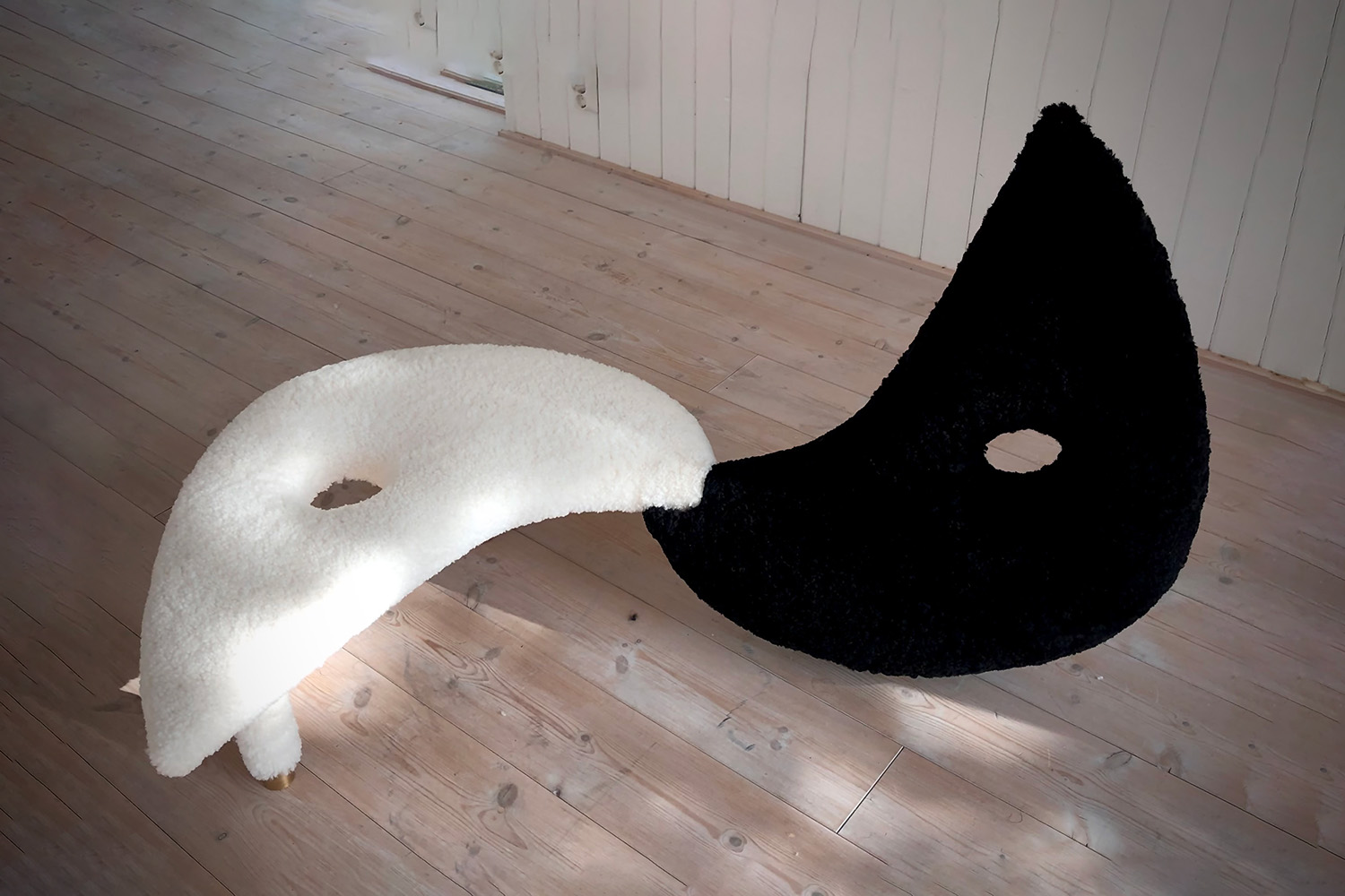 There is always a spiritual element in Susanne Sjögren’s designs. The seats of this bench are upholstered in black and white sheepskin, to represent the union and harmony between the extremes. The legs are made of brass.