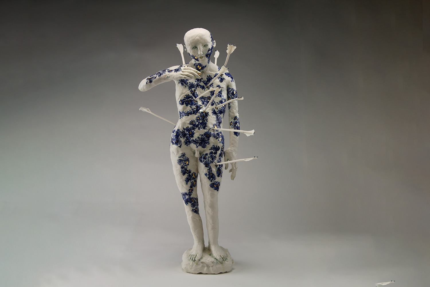 A representation of Saint Sebastian, this figure has removable arrows protruding from his body. Much of the modelling is focused on the hands and face. Cobalt blue flowers bleed and blur over the surface of the body, creating a sense of movement, with flecks of gold lustre over the blue glaze.