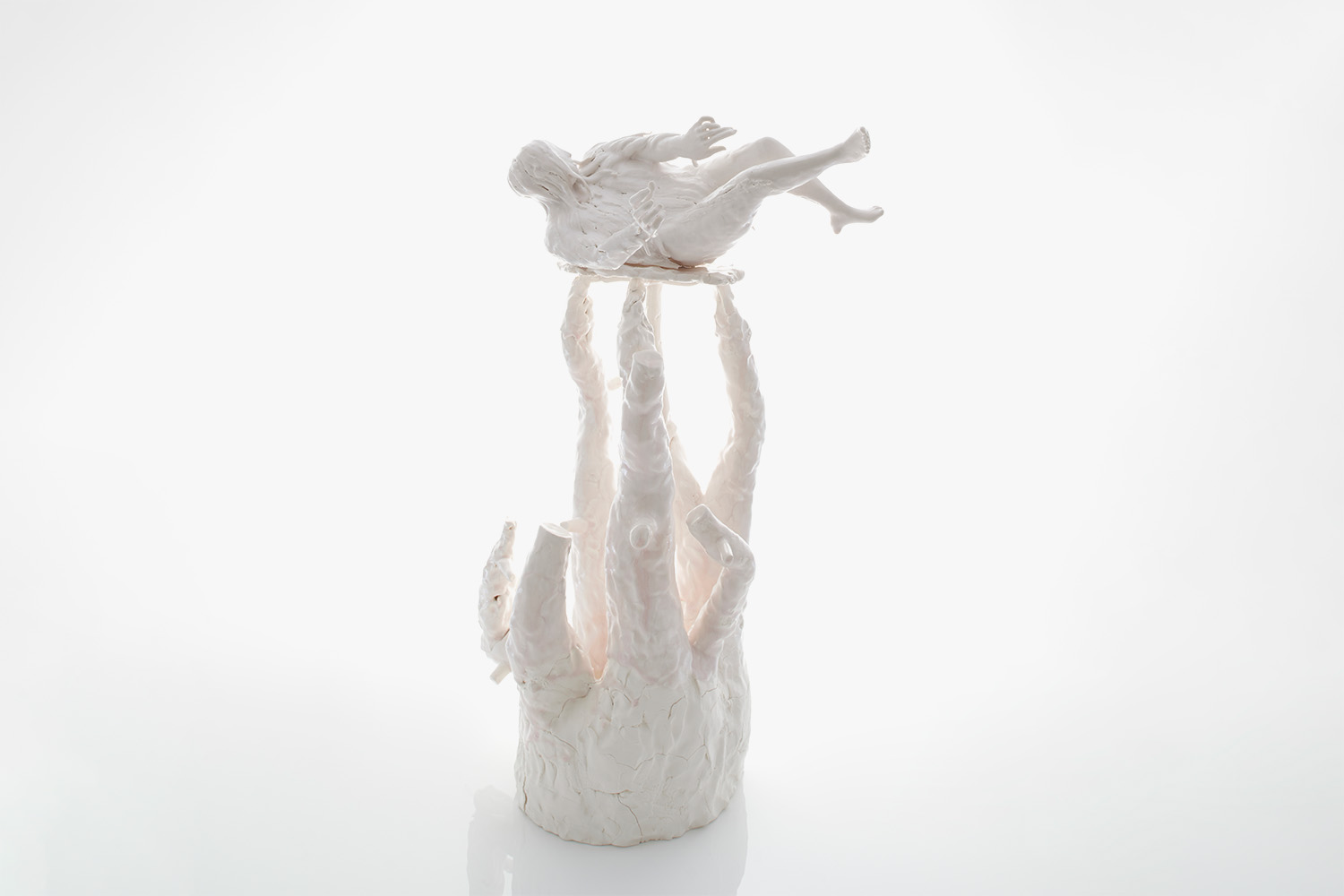 This sculpture depicts a reclining woman with her hair covering her face. The figure is resting on a tree root like form, and she could be rising or falling. The sculpture is hand-built using a pinching technique, and the hands, feet and face are subsequently modelled. The piece is glaze-fired to 1280°C.
