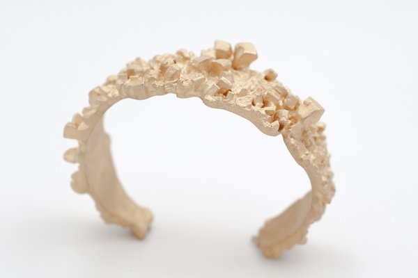 These earrings each consist of two slightly curved circles featuring a surface structure derived from an ancient granulation technique. The upper circle is smaller, and both are held together with a silver wire.