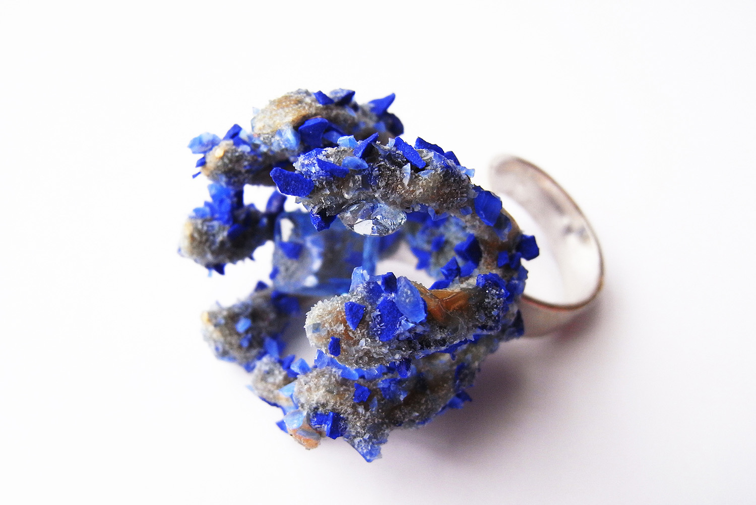 This is a forged open claw ring. It is made from one piece of silver, with crushed blue gemstones and faceted gemstones on the inside.