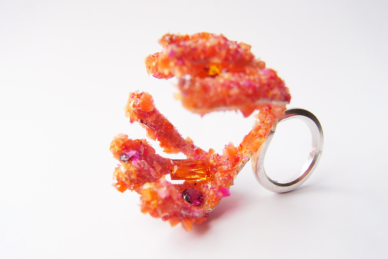 This is a forged open claw ring, made from one piece of silver and crushed orange gemstones. There are also some faceted gemstones on the surface of the claw.