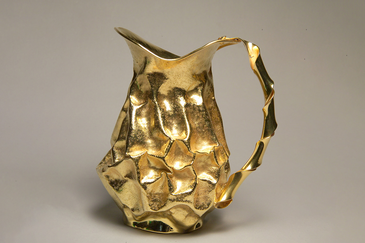 This jug is hammer-worked, embossed, chiselled and gilded in silver. The light plays on the surface, where the ripples and voids alternate dynamically thanks to the hammering and embossing.