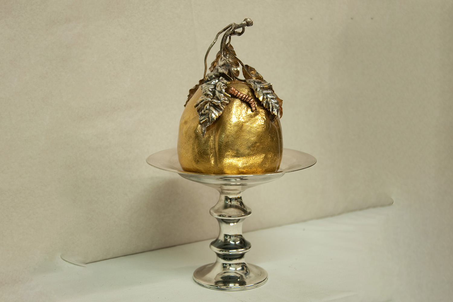 This is a salt shaker in the form of a quince. It is embossed, chiselled and partially gilded in silver. The base was turned.