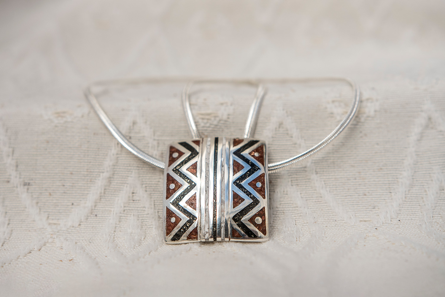 This piece is a square pendant in openwork silver with vertical geometric designs. It combines the colours silver of the metal, copper, black and white of the stones that compose it.