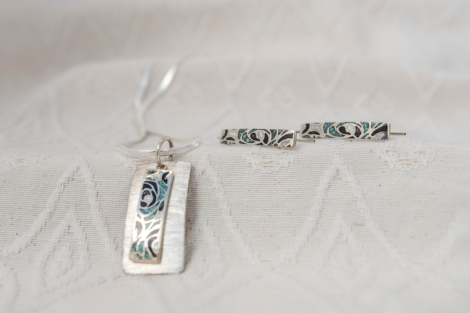 This is a set of pendant and rectangular earrings in silver and turquoise, grey and white stones. The pendant consists of two pieces, one in satin silver and the other in openwork silver containing the stones forming abstract floral designs joined by a ring. The rectangular earrings have the same design and colours as the central piece of the pendant.