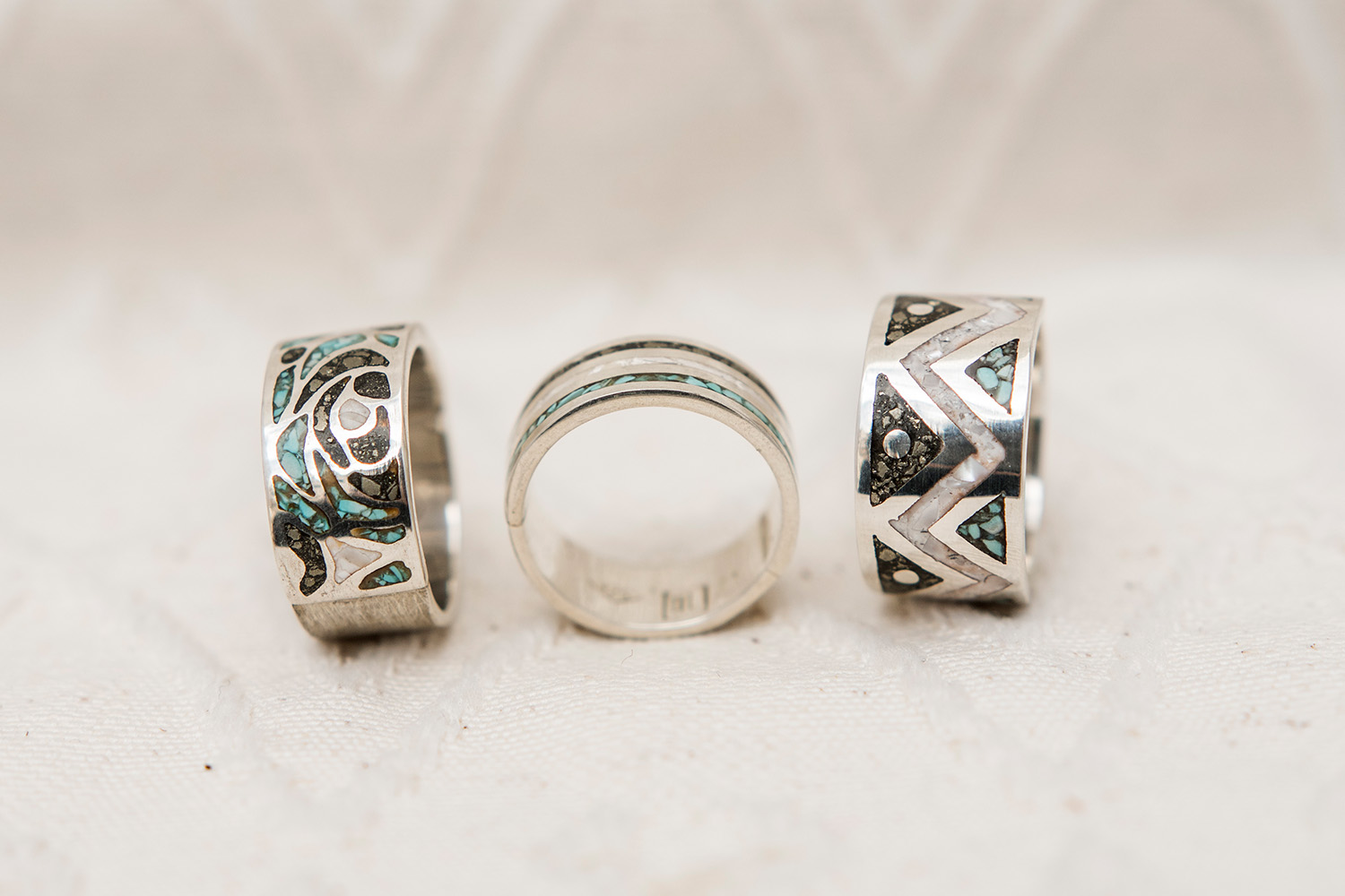 These are wide rings in silver and turquoise, grey and white stones. The Celina ring is an abstract floral design and the other two, Lineal and Nury, are geometric designs.