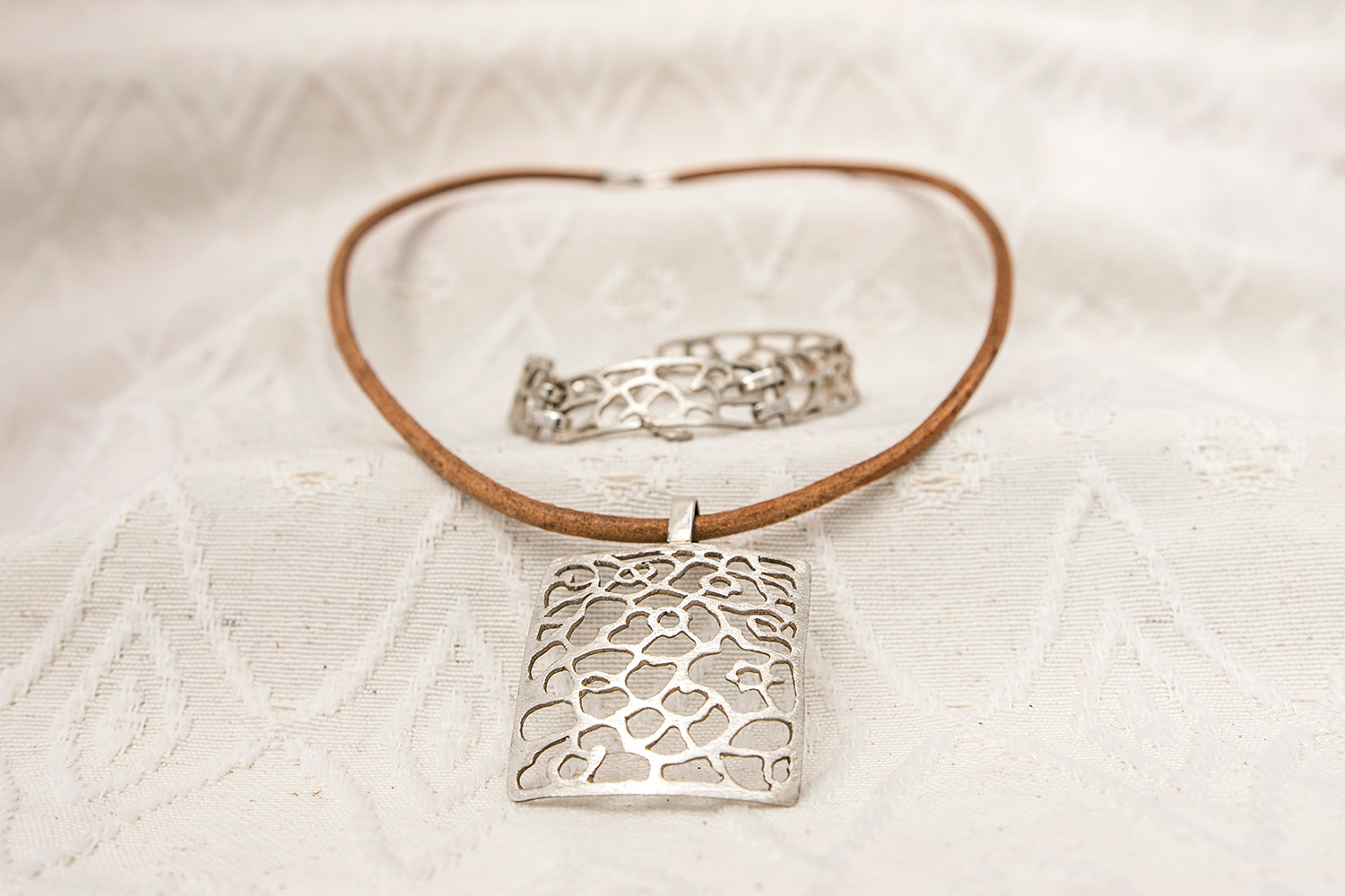 This is a square pendant in openwork and satin 925 sterling silver with an organic design inspired by the shapes of corals. It hangs from a camel coloured natural leather choker.