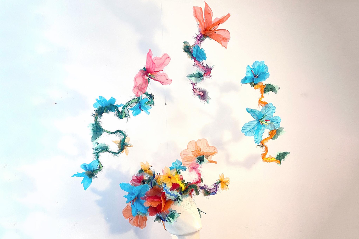 The On Fire piece unveils a stunning display of oversized, vibrant textile flowers that envelop the entire head area. Using a variety of flower-making tools, remarkable 3D volumes are achieved, ensuring a visually striking result. Finely crafted, the use of millinery wire allows for a freeform style, with some of the branches gracefully extending beyond the headpiece.