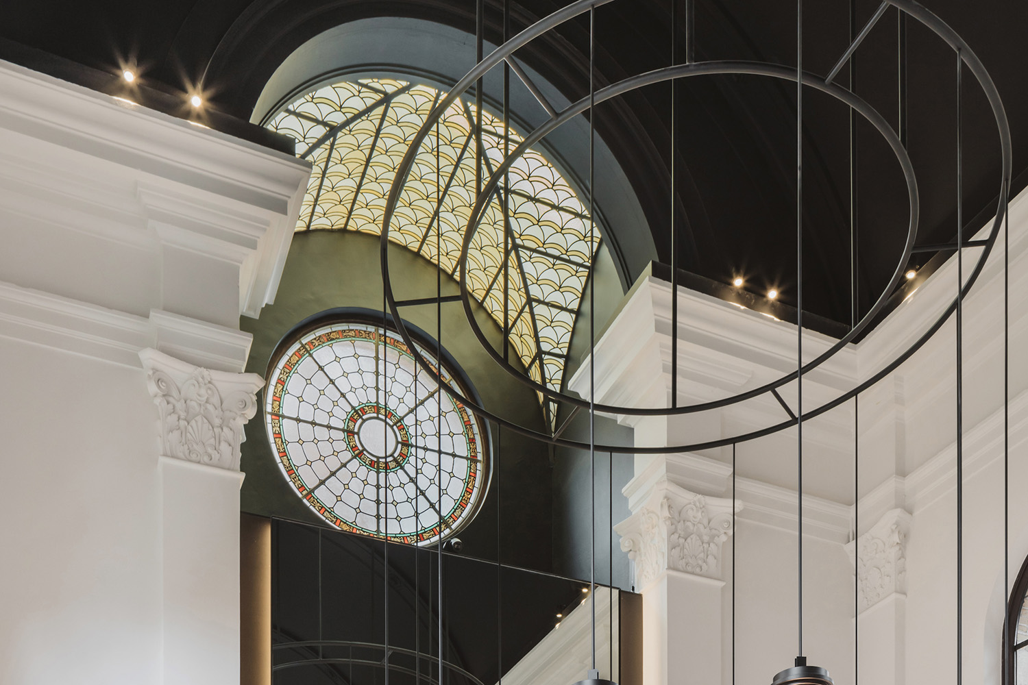 In Antwerp, the Chapel of Augustinian Convent was transformed into the bar of Hotel August. Above the bar, two stained-glass windows were restored by Mieke Verwaetermeulen – a circular window and a skylight. They offer a subtle addition to the contemporary lighting of the bar.
