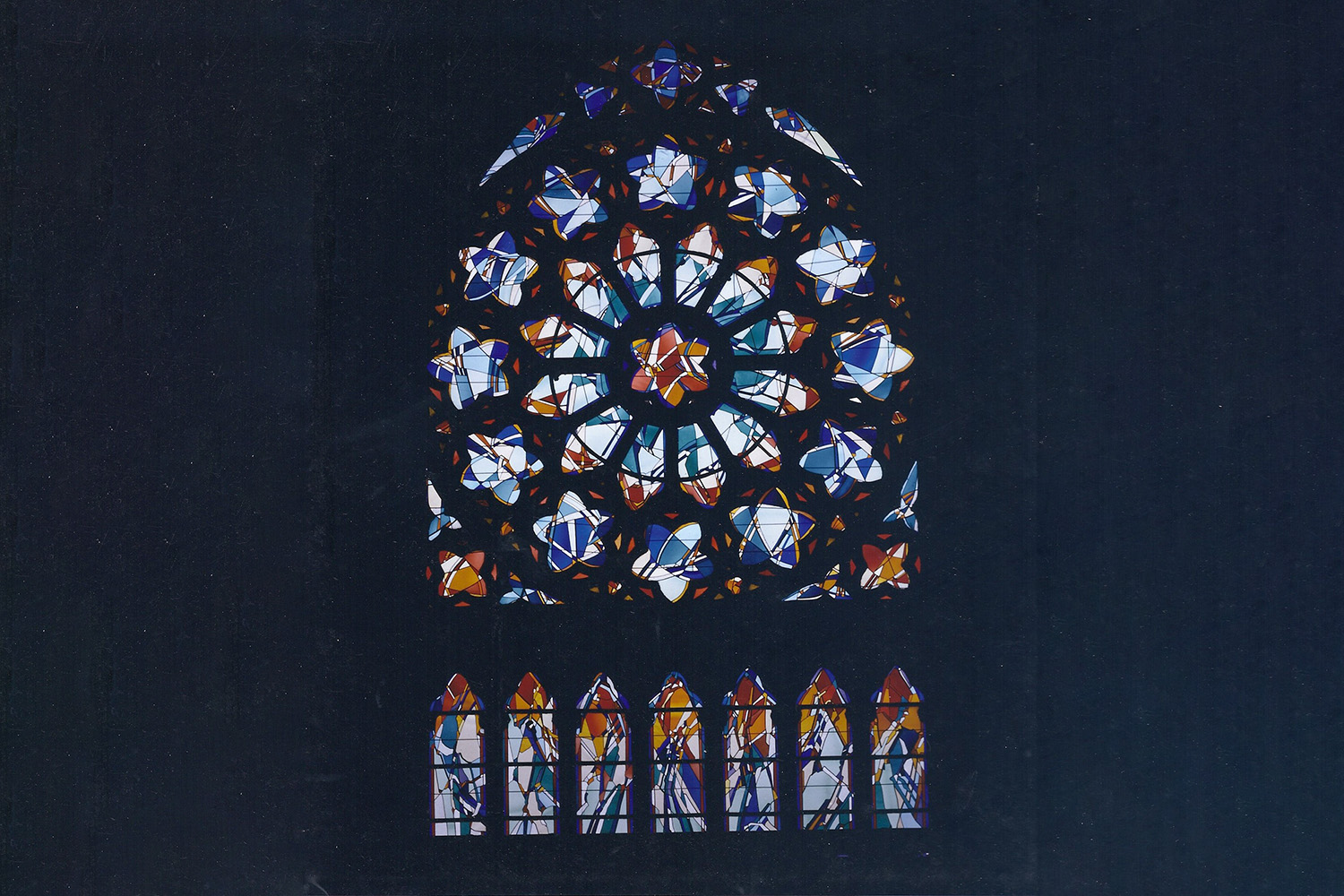 This stained glass in the western rose window of the Basilica of Dadizele was made by Mieke Verwaetermeulen. It is a contemporary composition in a basilica full of neo-Gothic stained-glass windows. The colours, and their distribution in the composition, are similar to those of the original stained-glass windows.