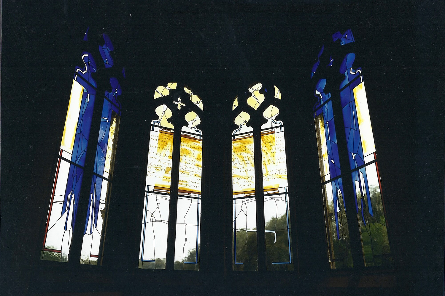 Here is the stained glass window artwork in an apse of the chapel at Arenberg Castle, now part of the University of Leuven. The blue refers to the colour of the university’s emblem. In the central window a scroll of text is painted in calligraphy. It gives an overview of important figures and events in the university’s history.