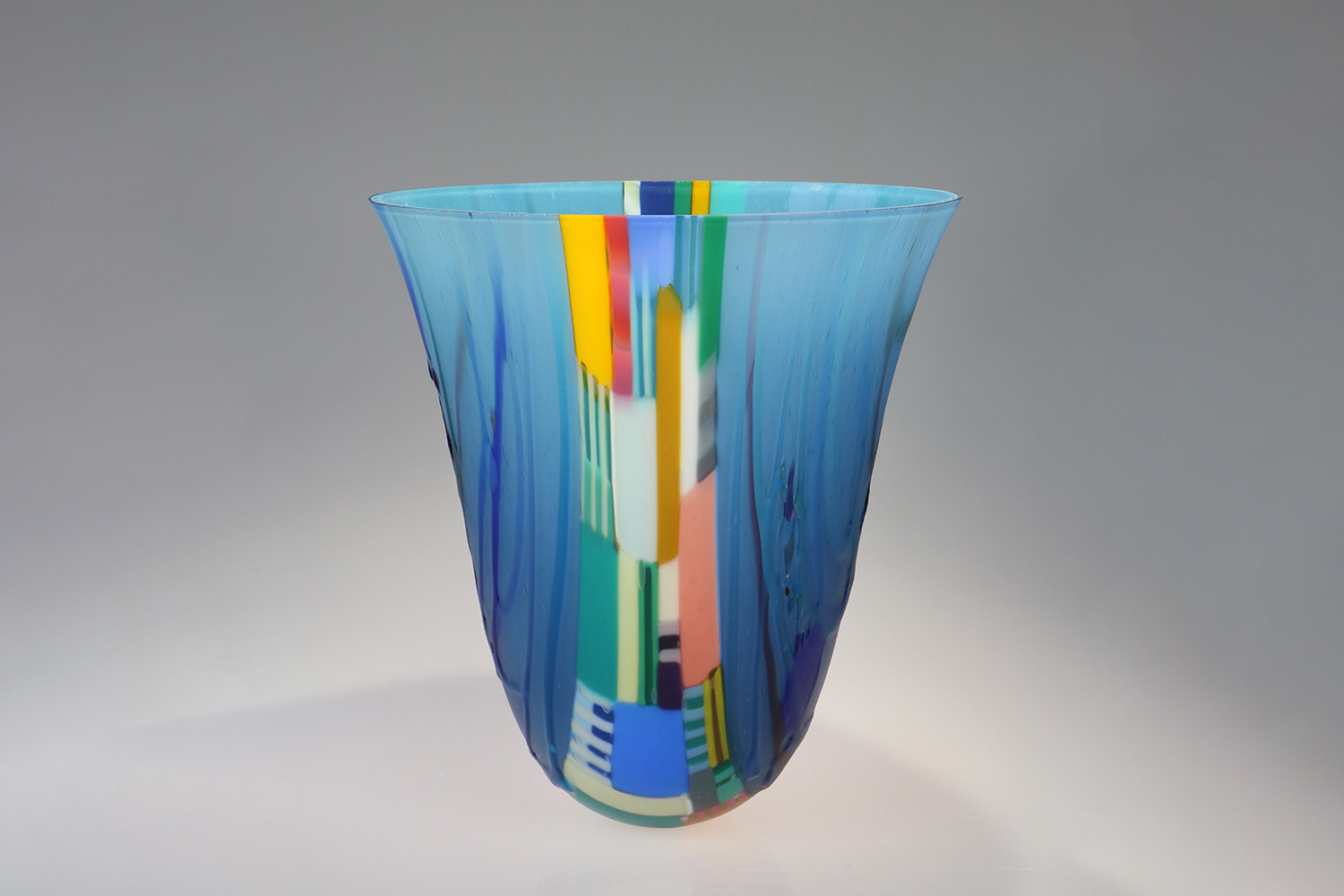 Many layers of glass were used to make this tall glass vessel which represents the varying colours of the sea around the Welsh coastline. It has a rippled wave-like texture on the surface and a delicate tapestry of colours at its centre.