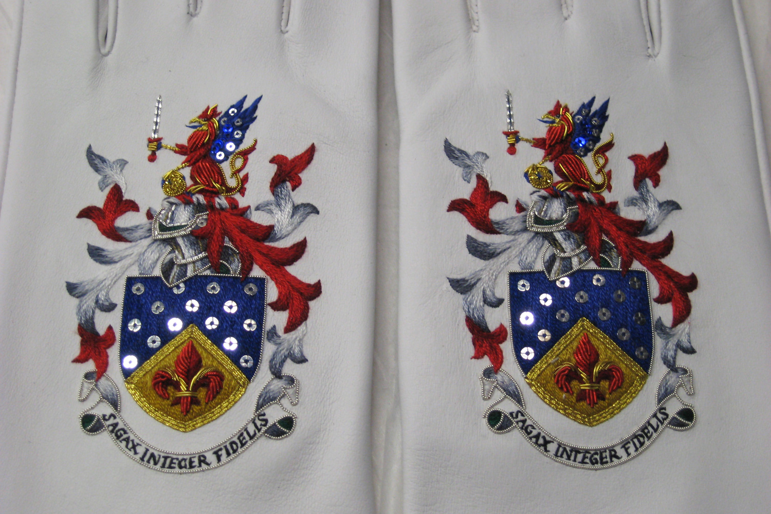 This is a pair of white children's gloves embroidered with the Coat of Arms of Timothy Hailes, Aldermanic Sheriff of the City of London. The arms are embroidered in traditional shades of blue, red and gold, in fine cotton threads using the technique of needle-painting, further embellished with silver plated and enamelled embroidery threads and silver plated spangles.