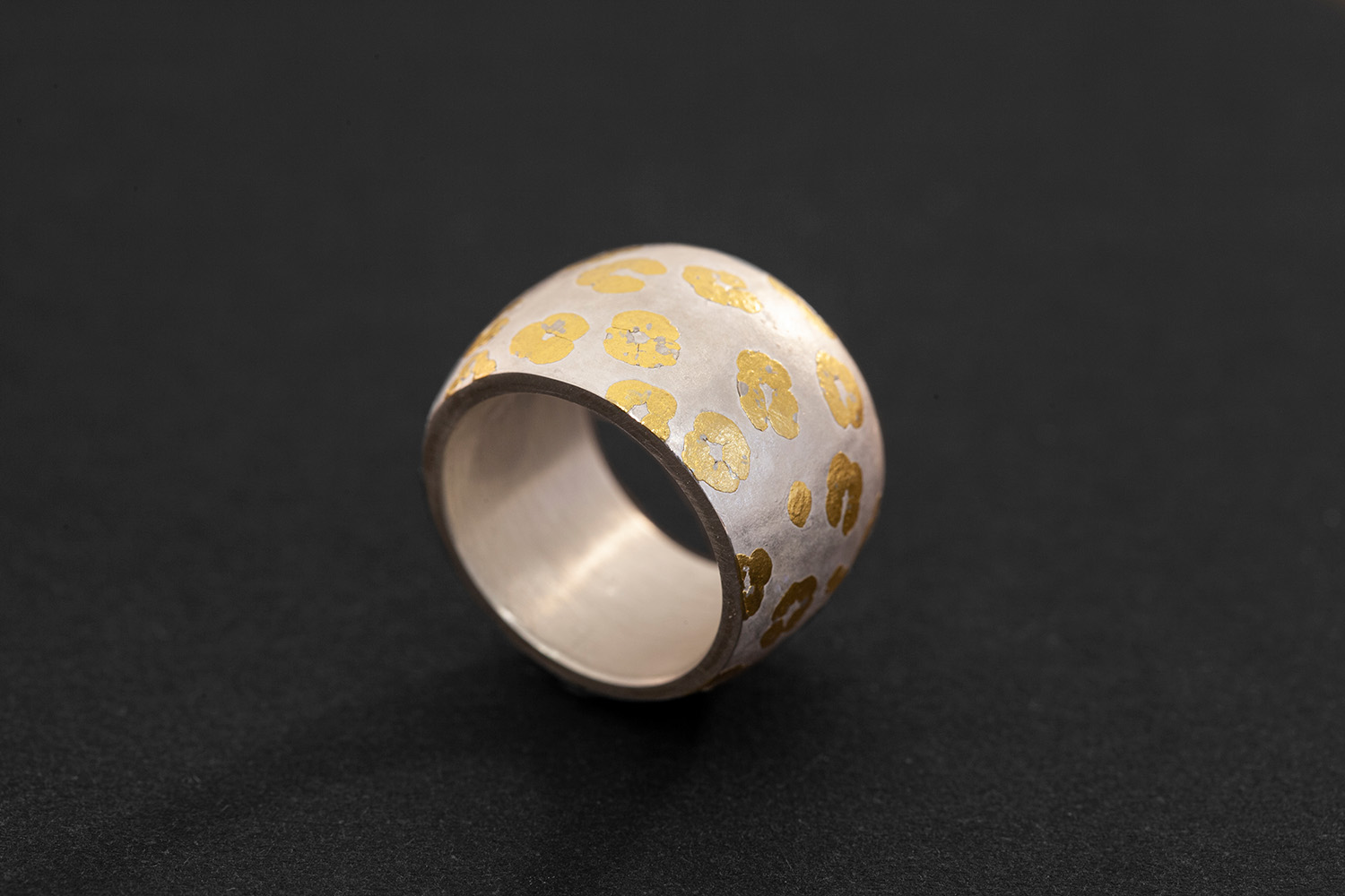 This is a slightly convex, heavy-weight ring crafted in two layers. The outer layer features delicate organic gold shapes, resembling animal print, while the inner silver layer ensures comfortable wear. Traditional soldering, rolling, and chasing techniques were employed.