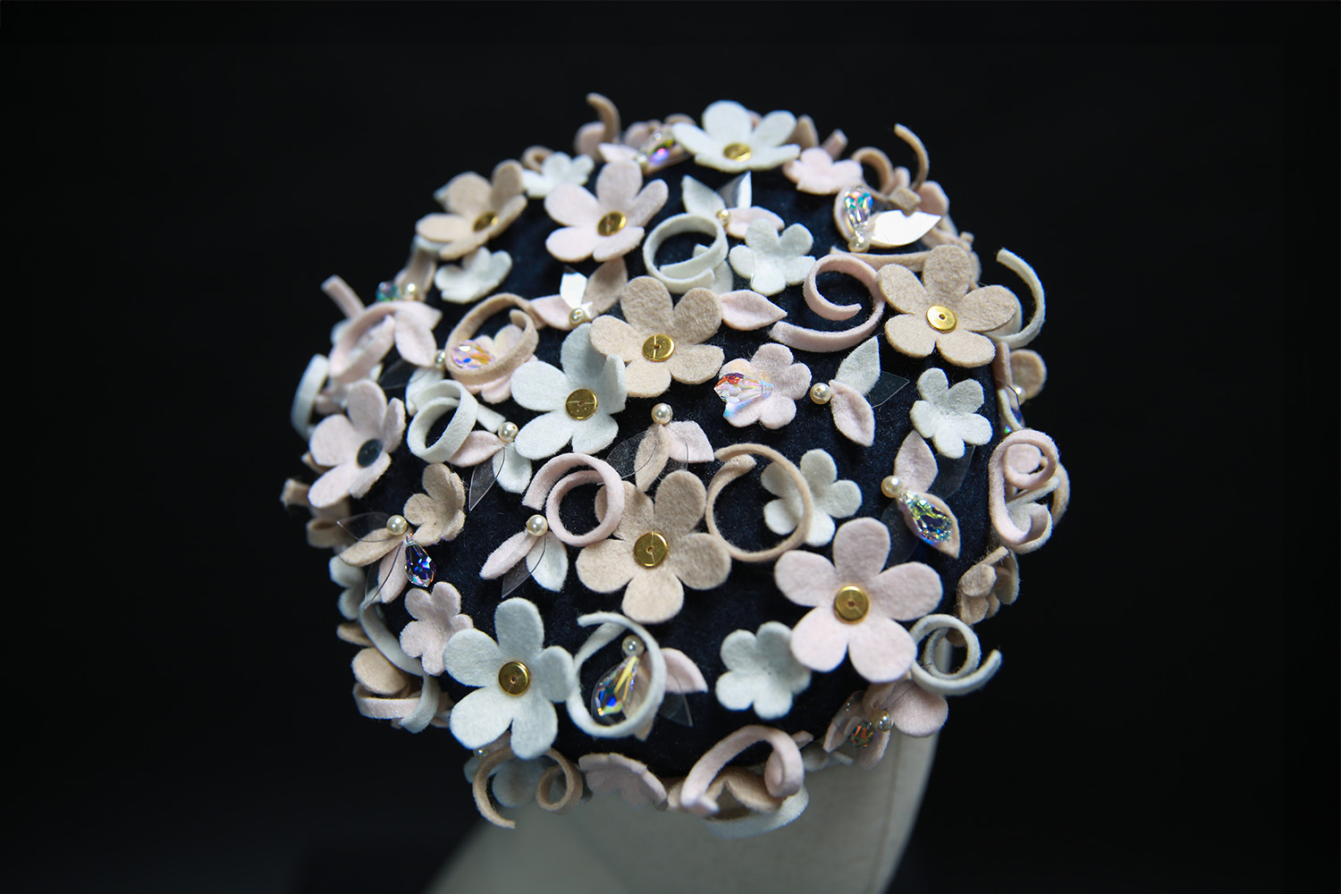 This navy felt pillbox hat is adorned with white and pastel felt daisies, petal clusters and felt twists with gold metal trimmings, pearls and light-catching crystals.