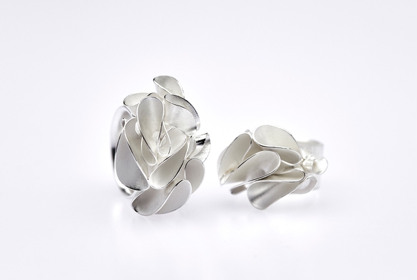 This brooch is a composition of ten individually folded and stacked leaf shape elements of various sizes. All elements are made from sterling silver, hand mounted and filed to shape by Claudia Westhaus. The three-dimensional effect is increased by the overlapping arrangement into a cluster reminiscent of plants. The colours vary from silver to a powdery white which is caused by etching on the silver surface.