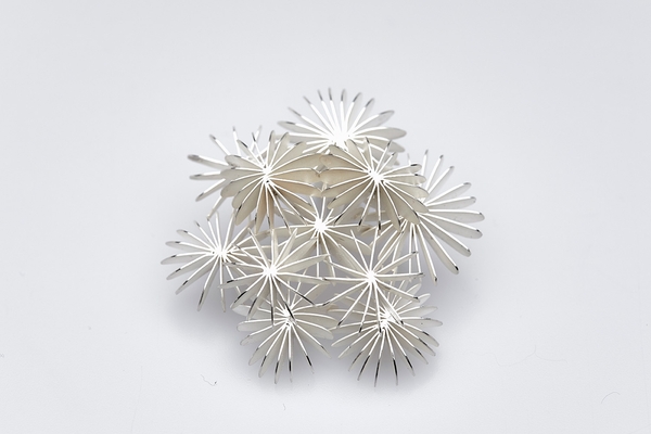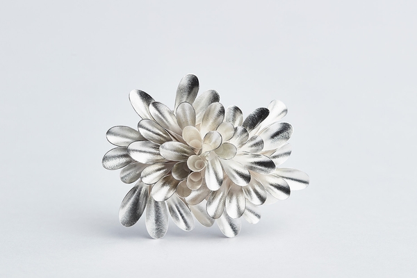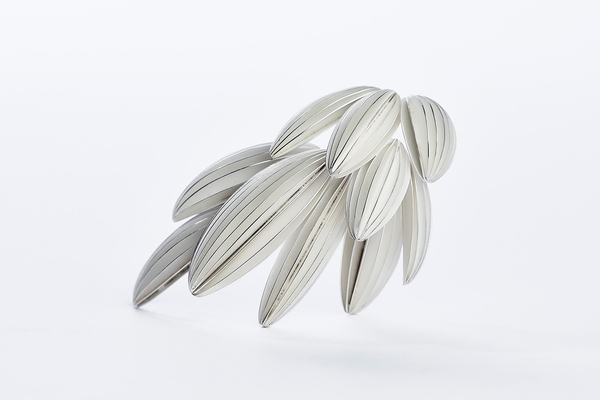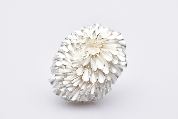 These two rings made by Claudia Westhaus have a top composed of a wave-like folded sheet in various sizes. All pieces are made from sterling silver, hand mounted to create fluidity and a sense of playfulness within the ring objects. The colours range from silver to a powdery white which is obtained by etching on the silver surface.