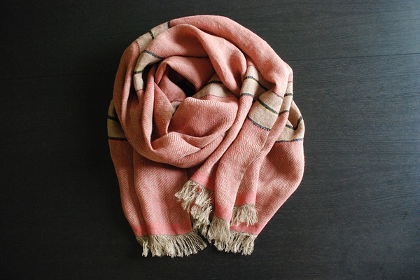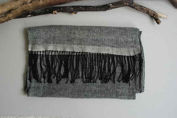This is a handwoven luxury brick-red wide fringed shawl. The shawl is very soft, flowing, with a subtle graphic pattern in red and grey.