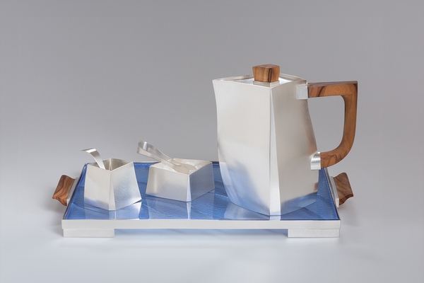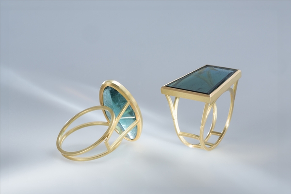 These ring and pendant forms were inspired by the architectural structures of bridges. The elegant ring and pendant lines are combined with transparent rutile quartz circles.