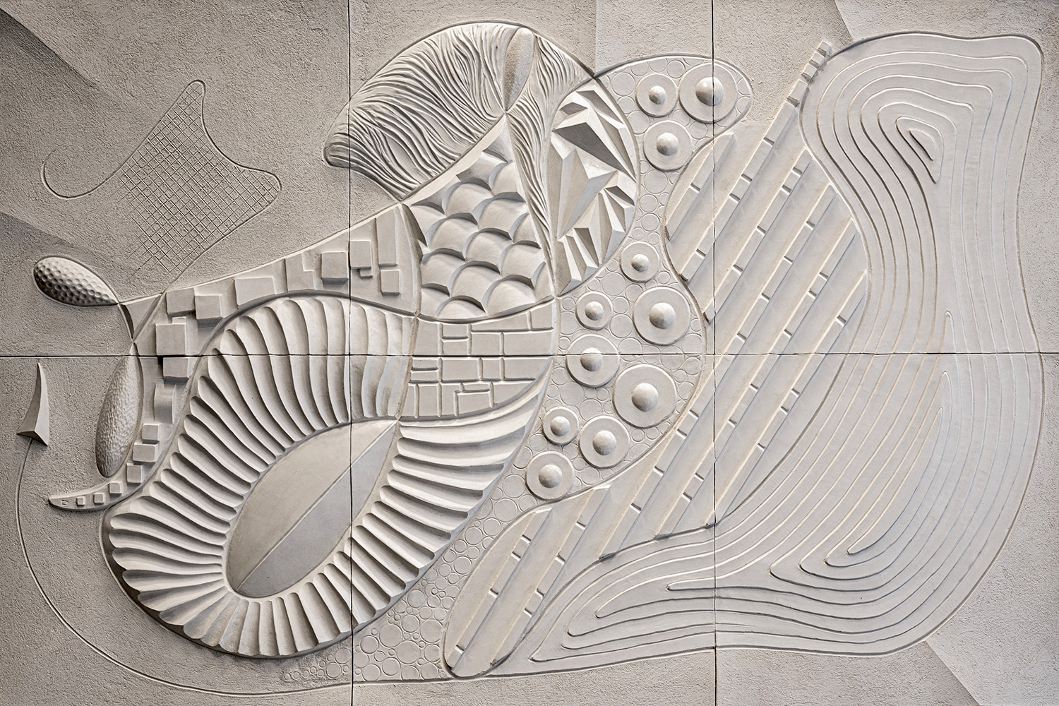 This work consists of six bas-relief panels with lines and shapes chasing each other in a game of light and shadow, sharp edges and roundness, opacity and brightness.