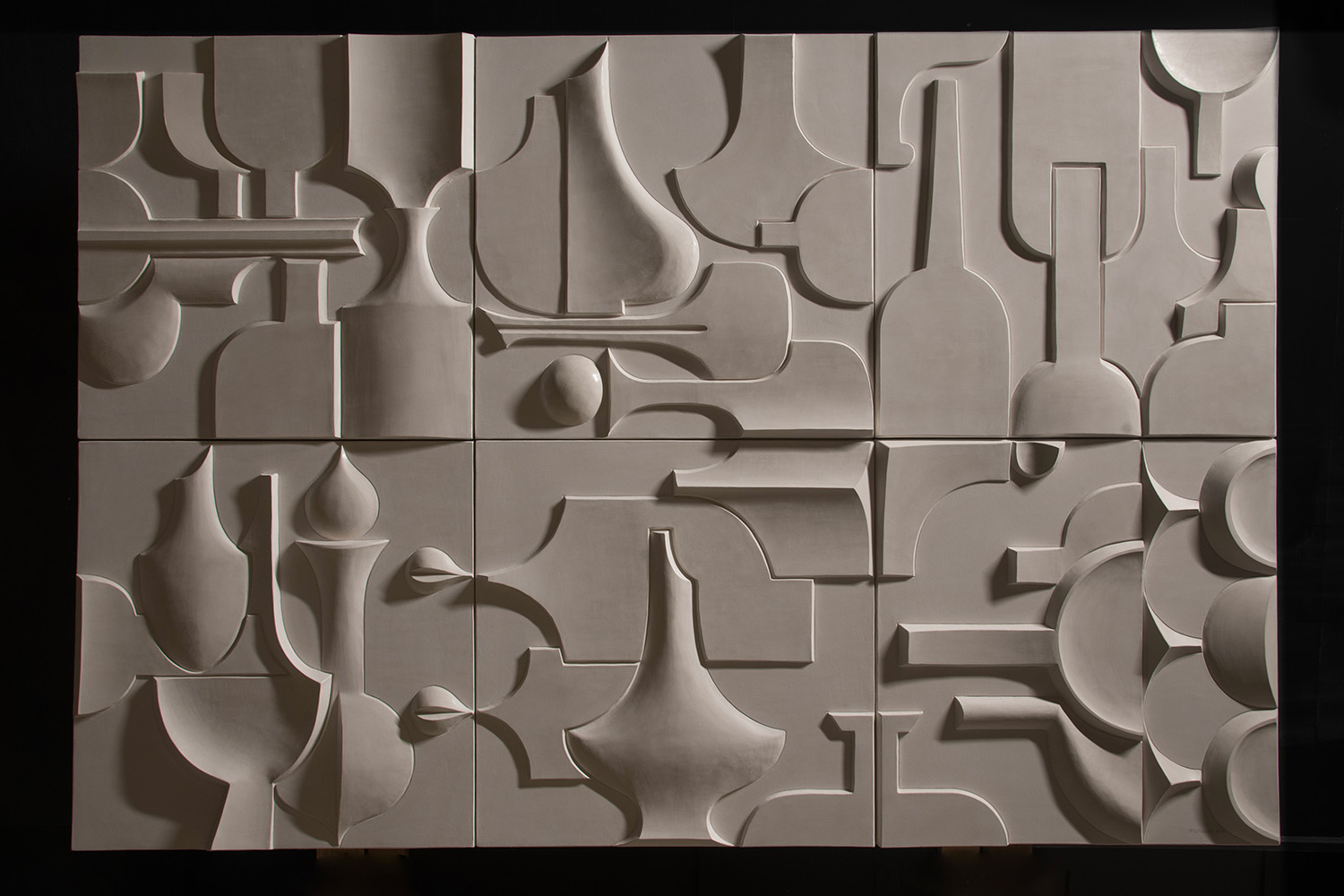 This entire work consists of six modular bas-relief panels which can be assembled according to different combinations and orientations. Thus each individual unit can be seen as a single work or part of the whole. The harmony of these lines comes form the figures recalling bottles and cups that invite the viewer to interpret their contents with a positive perspective.