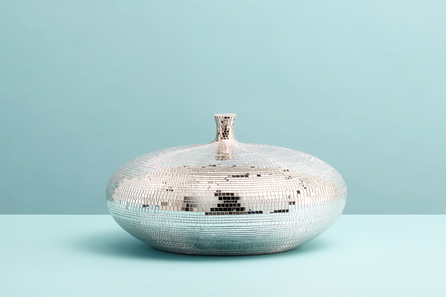 This handmade ceramic bowl with a convex lid is coated in mirror tiles in three different dimensions: 5x5mm, 7.5x7.5mm and 1x1cm. The tiles are intended to refract any lights, thus creating fairytale, mesmerising reflections.