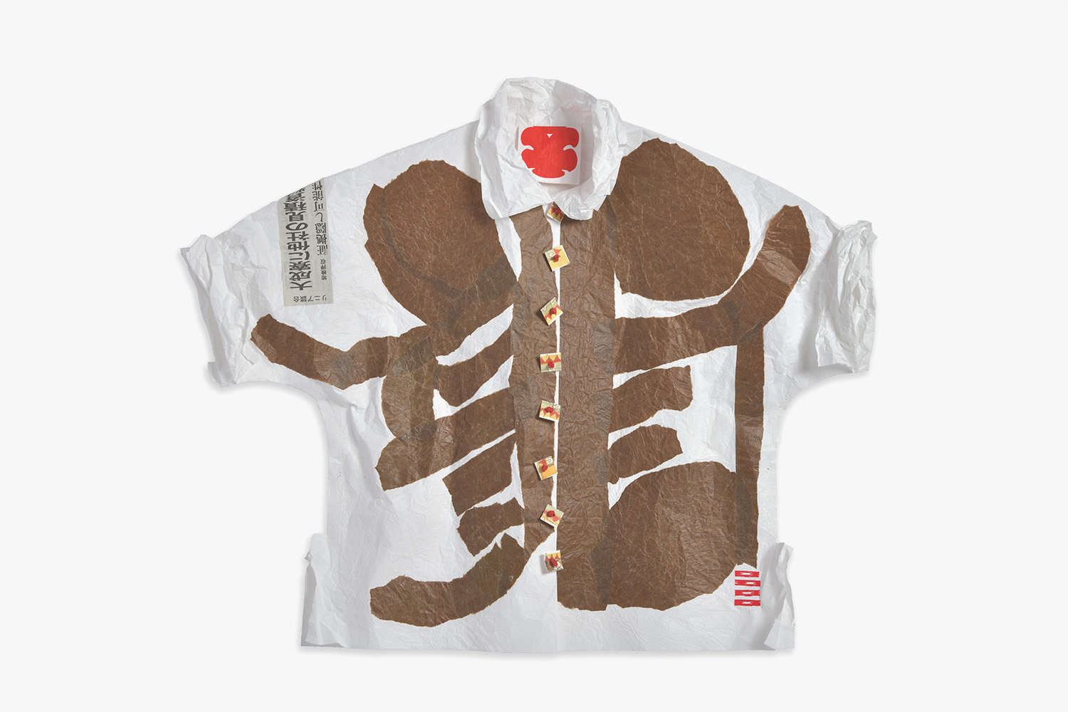 This 3D paper collage is a brown and white Japanese kite shirt. During a trip to Japan, Liz Valenti visited the Kite Museum in Tokyo and was inspired to make this piece, that reflects kite graphics alongside newspaper cuttings and buttons made from Hokusai print cards. The two main papers used are from industrial waste. The shirt is framed.
