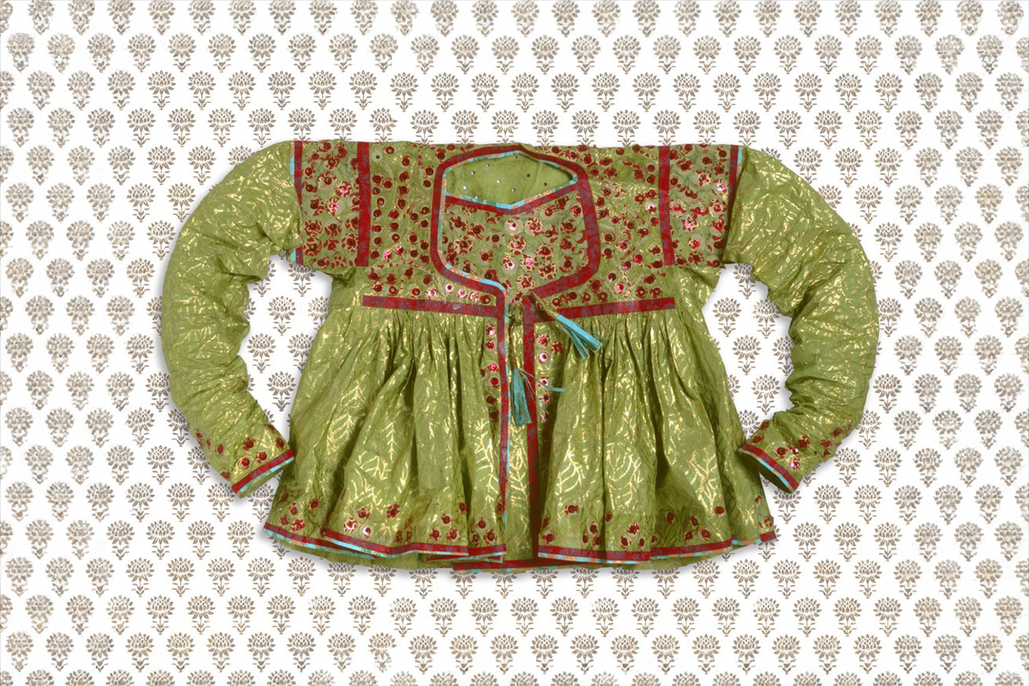 This is a 3D paper collage in a frame, representing a typical Mughal tunic. It is made from printed mulberry papers that Liz Valenti assembled over five years, from many visits to India and Nepal. A Rajasthani tunic provided the basis for pattern cutting the tunic. The decorative elements are made from cutting and layering six embossed gold stamped contrasting papers.