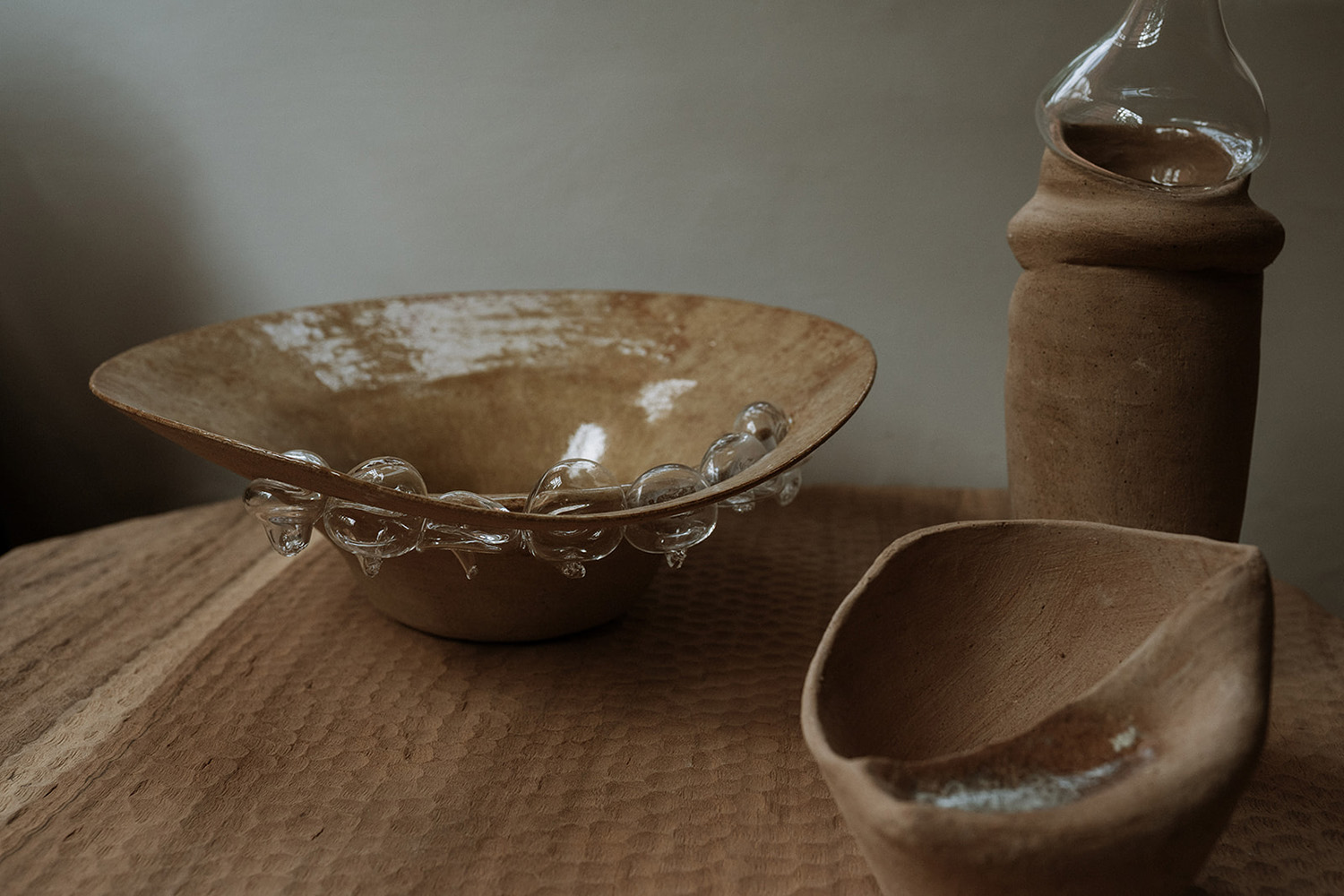 These ceramic containers in earthen colours have a matte finish which represents their terroir of origin, Río Seco. This is located in Cesar province in northern Colombia, and is where Juan Camilo Montenegro’s grandfather was born. One of the vessels is complemented with blown glass bubbles and molten glass during the one and same firing as the ceramic.